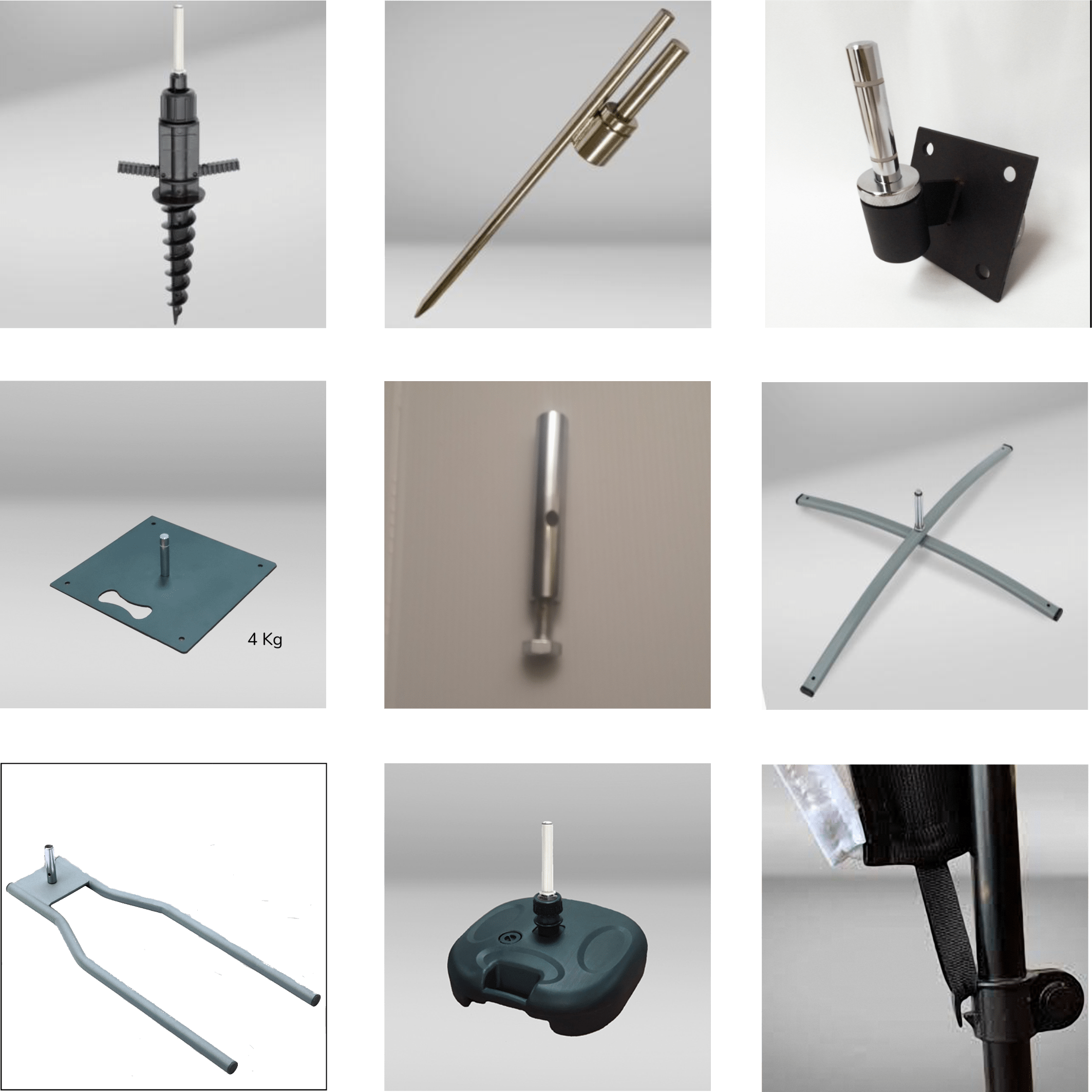 Base de agua o arena: Bolsas rellenables (10-20 litros) que proporcionan estabilidad en terrenos irregulares o ventosos.